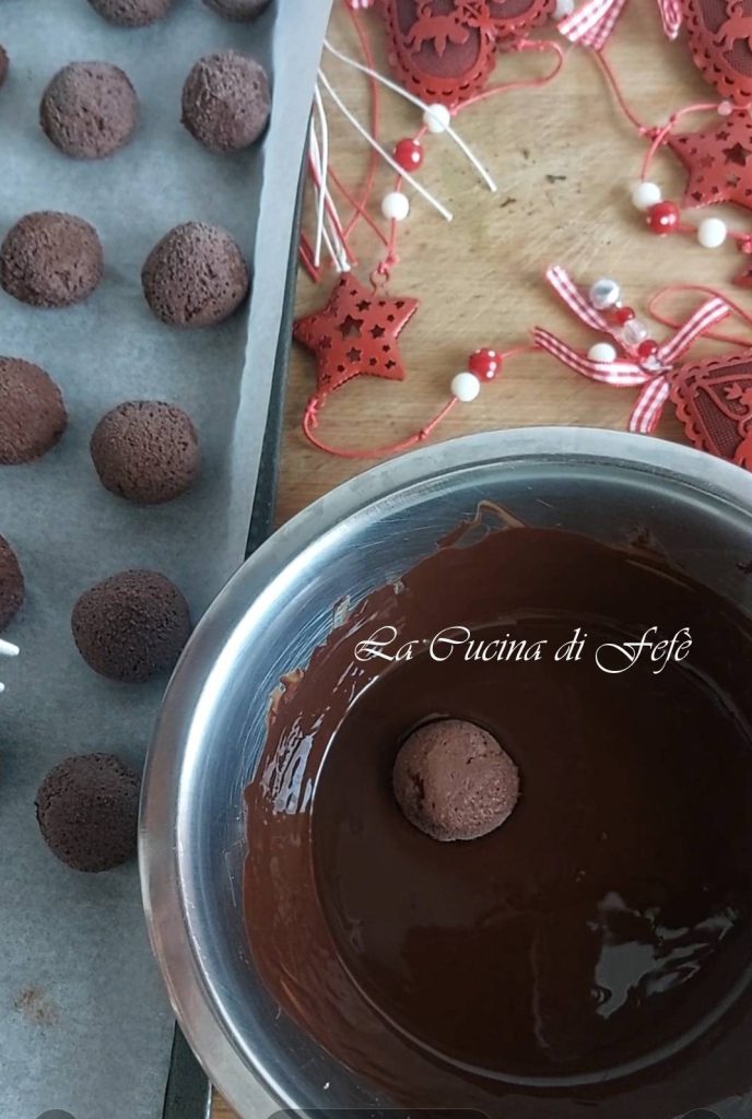 Hacke die dunkle Schokolade in einer Schüssel und schmelze sie im Wasserbad in einem Topf. Füge auch das Öl hinzu, rühre um und tauche die kalten Trüffel schnell ein, bis sie vollständig bedeckt sind, dann hebe sie mit Hilfe von zwei kleinen Gabeln heraus und lasse überschüssige Schokolade abtropfen*.