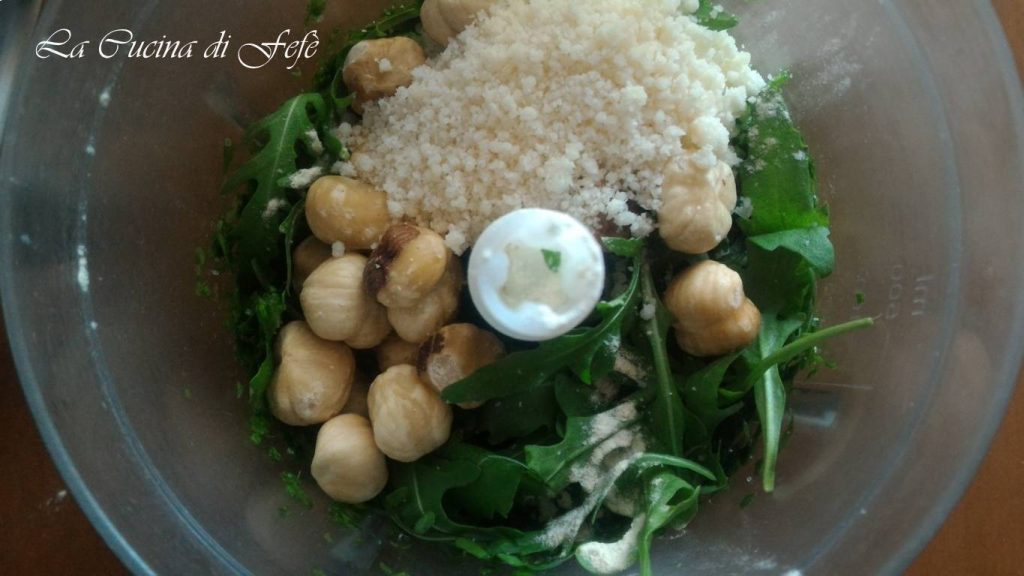 Fügen Sie auch die Haselnüsse, die Knoblauchzehe oder den Knoblauchpulver und den Grana hinzu.