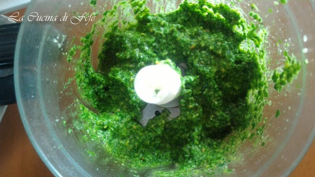 Bereiten Sie separat Ihr Rucola-Pesto vor. Nachdem Sie die Blätter gründlich unter fließendem Wasser gewaschen haben, drücken Sie sie gut aus und geben Sie sie in einen Mixer.