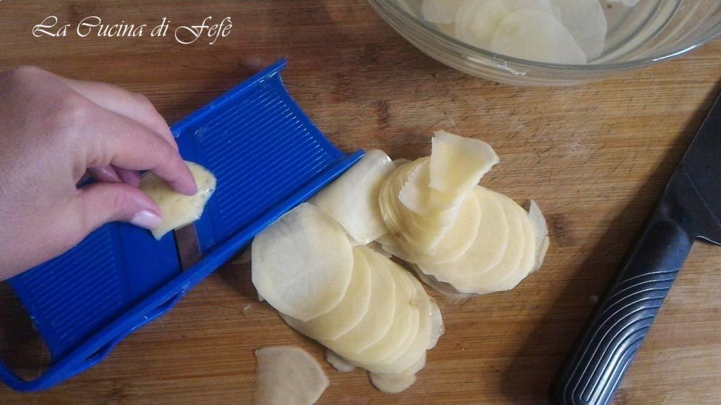 In der Zwischenzeit mit Hilfe einer Mandoline die Kartoffel in sehr dünne Scheiben schneiden.