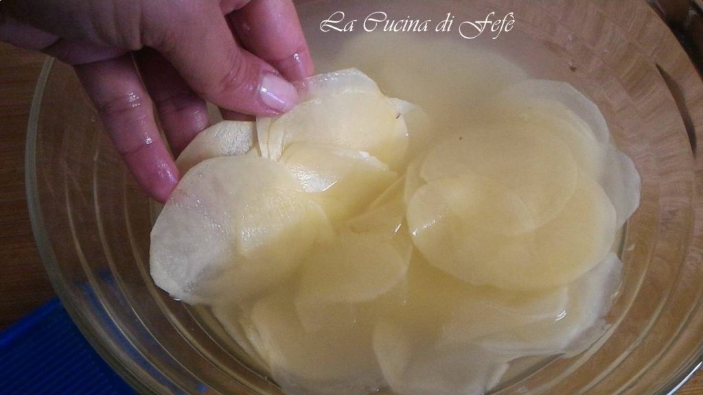 Die Kartoffelscheiben in eine große Schüssel mit kaltem Wasser geben, um ihre Stärke freizusetzen.