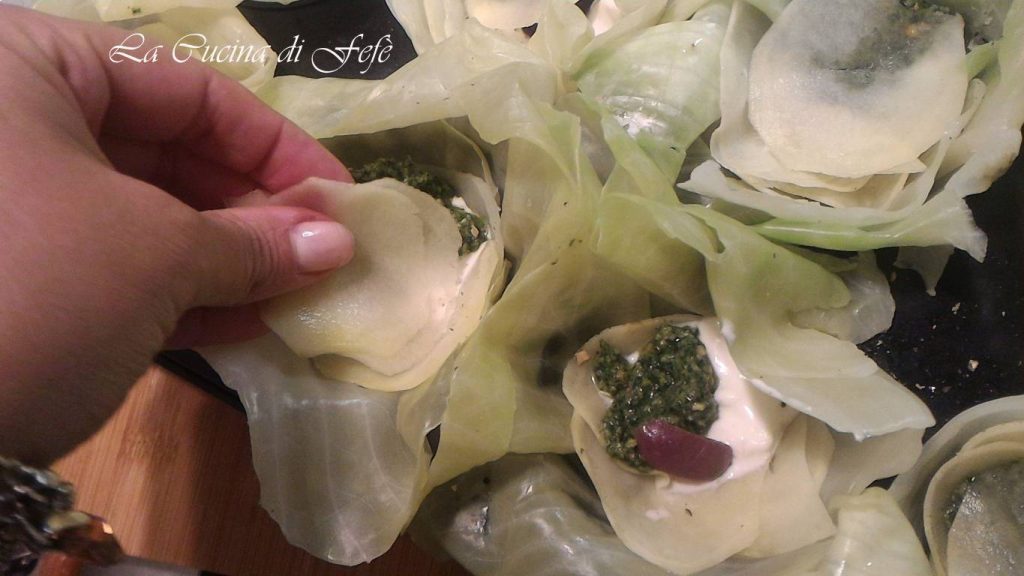 Diese Schätze herzustellen ist ganz einfach und erfordert nur wenige Schritte: Zuerst blanchiert man die Wirsingblätter für einige Minuten, formt die Taschen, indem man die Blätter direkt in Muffin-Backformen legt und füllt, indem man Schichten aus dünn geschnittenen Kartoffeln, hausgemachtem Rucola-Pesto und cremigem Stracchino schafft.