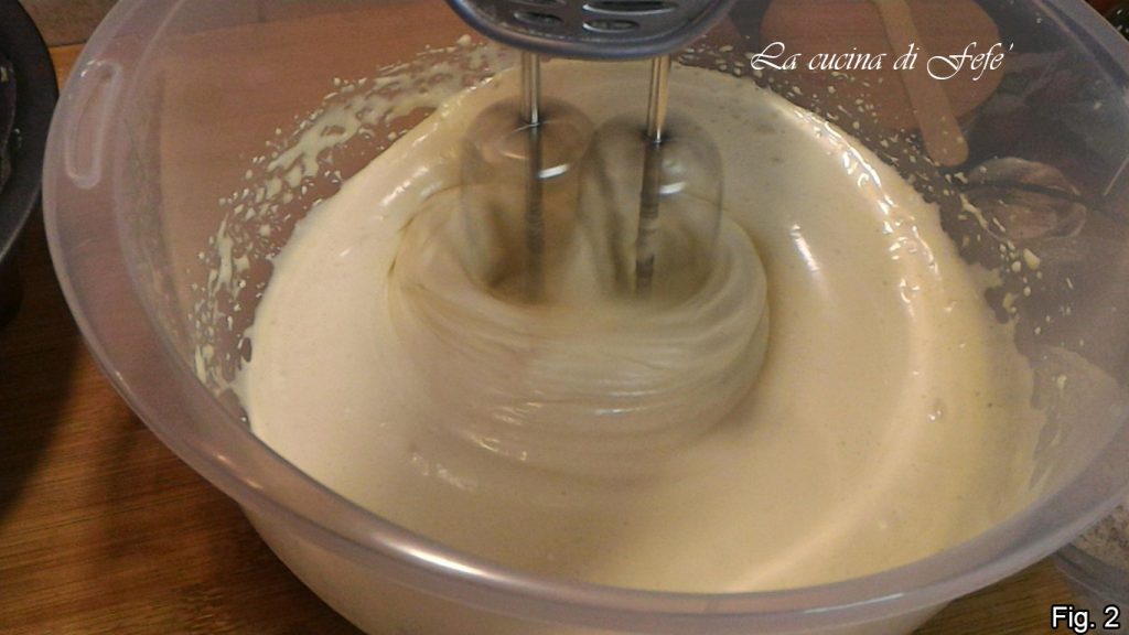 Mit den elektrischen Schneebesen auf höchster Geschwindigkeit die Eier für 5′ mit dem Zucker in einer Schüssel verarbeiten (Abb. 1).