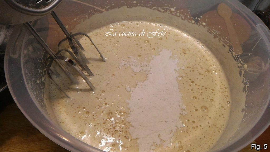 Fügen Sie auch die vorher mit Backpulver gesiebten Mehle nach und nach hinzu (Abb. 5).