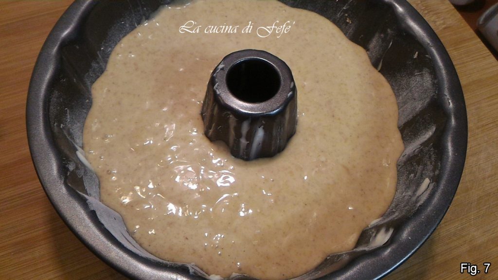 Wenn alles gut vermischt ist, den Teig in eine bereits gefettete und bemehlte Form gießen und bei 180°C für 35′-40′ backen. Überprüfen Sie die Garzeit mit einem Zahnstocher, da die Backzeiten von Ofen zu Ofen variieren (Abb. 7).