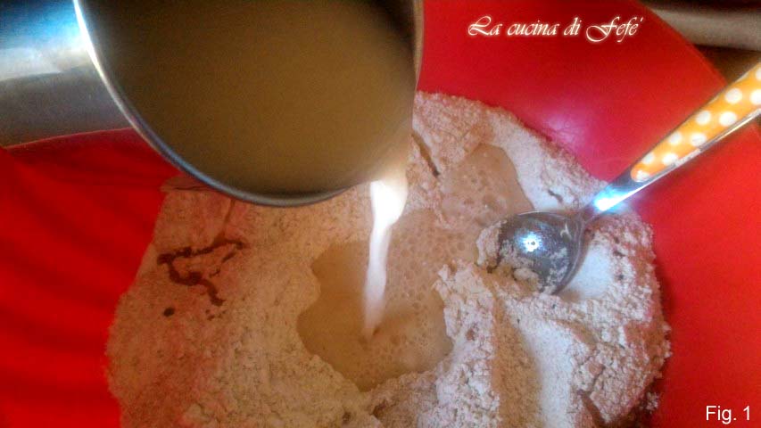 • In einer großen Schüssel die beiden Mehlsorten, das Salz und das Öl vermischen. Die Hefe in lauwarmem Wasser zerbröseln und auflösen und langsam in die Mitte gießen (Abb. 1).