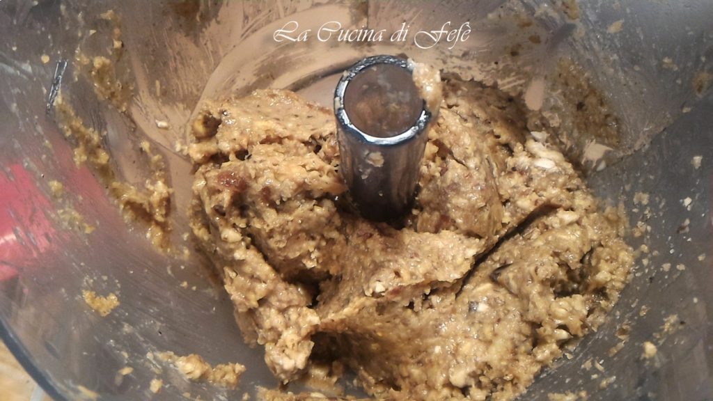 • Im Behälter eines Mixers oder einer Küchenmaschine die Nussmischung und die zuvor entkernten Datteln geben.