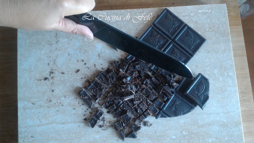 • In der Zwischenzeit die dunkle Schokolade auf einem Schneidebrett grob mit einem Messer hacken.