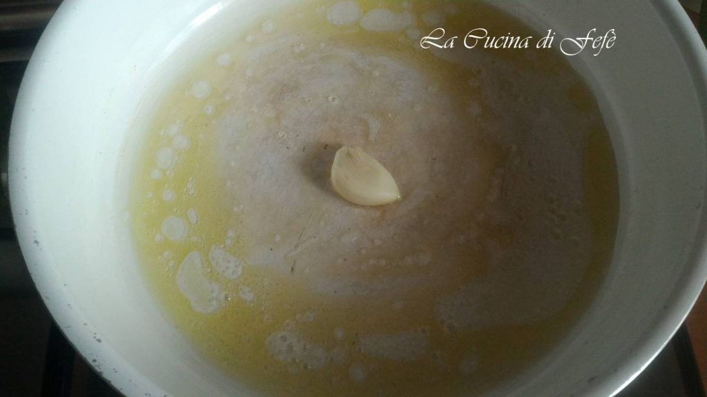 In einer großen antihaftbeschichteten Pfanne legen Sie die geschälte und leicht zerdrückte Knoblauchzehe mit 2 großzügigen Esslöffeln Öl und lassen Sie sie für 1 Minute goldgelb werden.