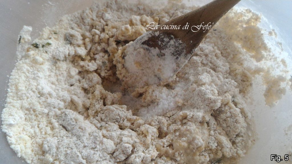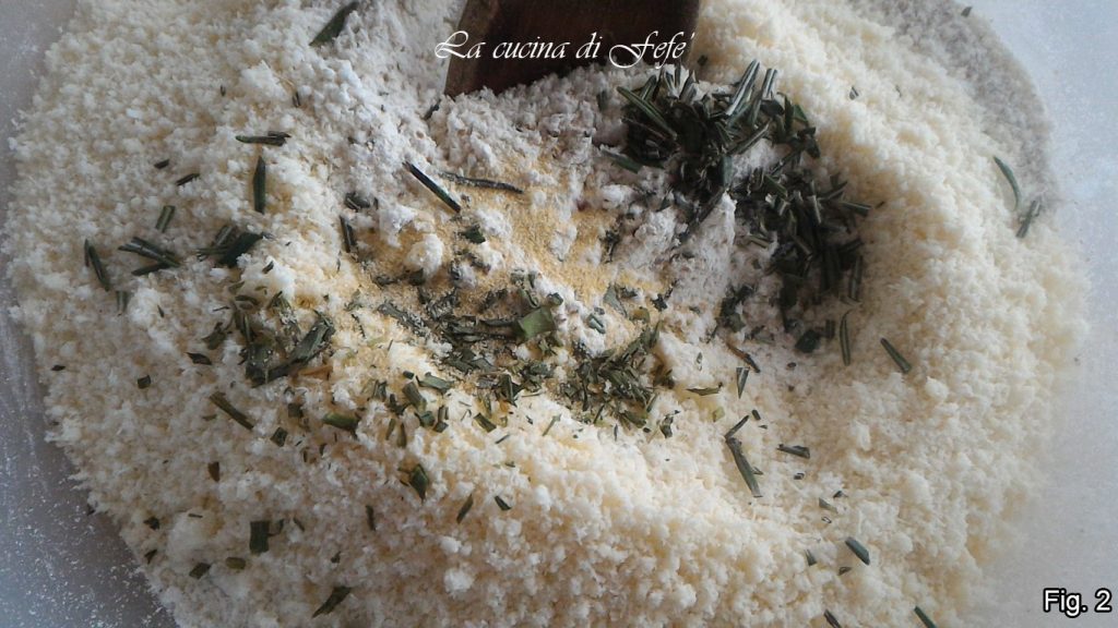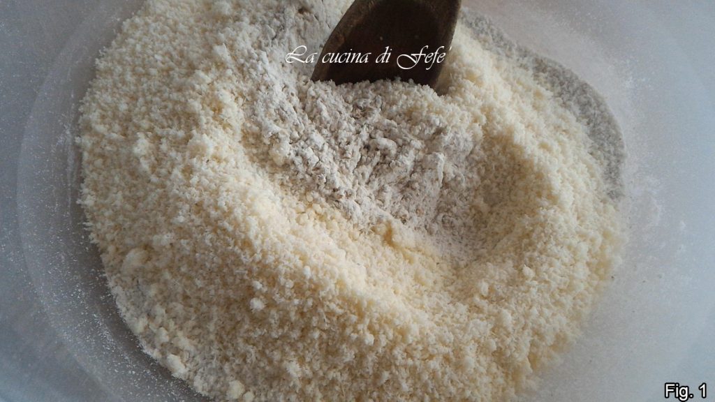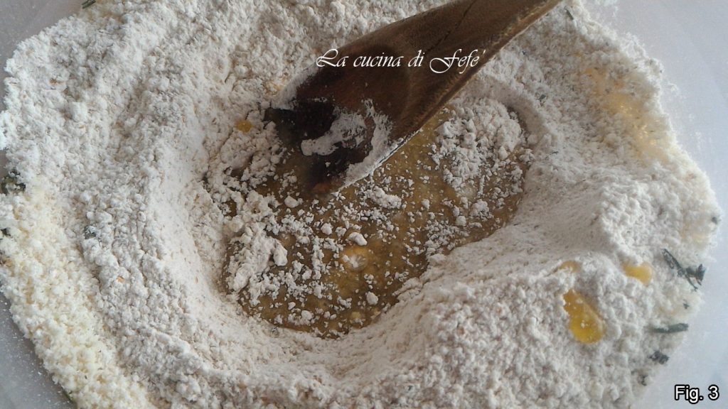 In einer großen Schüssel das gesiebte Mehl mit dem geriebenen Grana vermischen und mit einem Löffel rühren (Abb. 1).