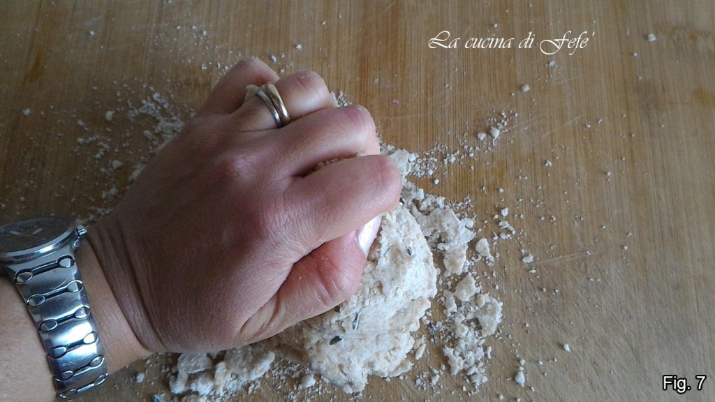 Anschließend den Teig auf eine Arbeitsfläche legen und kräftig etwa 10 Minuten lang kneten, bis eine kompakte und homogene Kugel entstanden ist (Abb. 7).