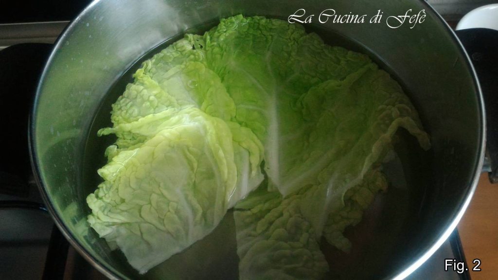 Wasche sorgfältig 8 große und knackige Wirsingblätter und entferne mit einem Messer den harten Mittelstrunk, der zäh und schwer verdaulich ist.
