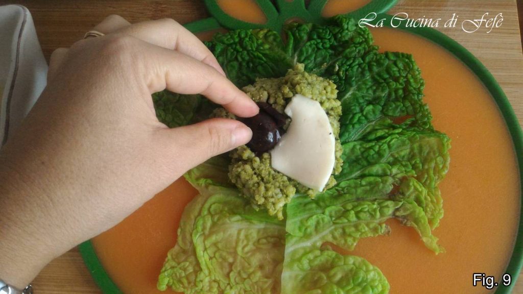 Lege nun jedes Wirsingblatt vollständig auf das Schneidebrett, gib einen großzügigen Löffel Pesto-Reis darauf und belege mit 1–2 Scheiben Scamorza und Oliven.