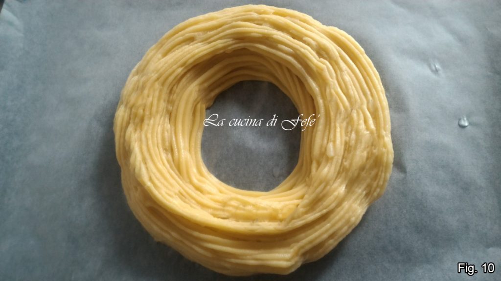 Über die gerade gezeichneten 3 Kreise ziehen Sie weitere 3, ohne den kleinen Kreis zu schließen, damit Ihr Zeppolone beim Backen schön aufgeht. Backen Sie im vorgeheizten Ofen bei 200°C in der mittleren Schiene des Ofens für etwa 18-20 Minuten. Sie werden sehen, dass der Zeppolone sehr stark aufgeht. Dann senken Sie den Ofen auf 180°C und backen Sie ihn für weitere 20 Minuten**.
