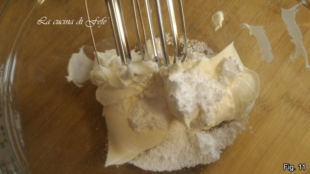 Schalten Sie den Ofen aus und lassen Sie eine Ofentür mit einem Holzlöffel offen, um die Luft zirkulieren zu lassen, lassen Sie ihn dann für 5 Minuten im Ofen. Herausnehmen und vollständig abkühlen lassen. In der Zwischenzeit die Mascarponecreme zubereiten, indem Sie den Mascarpone mit dem Joghurt und dem gesiebten Puderzucker eine Minute lang in einer Schüssel verarbeiten.