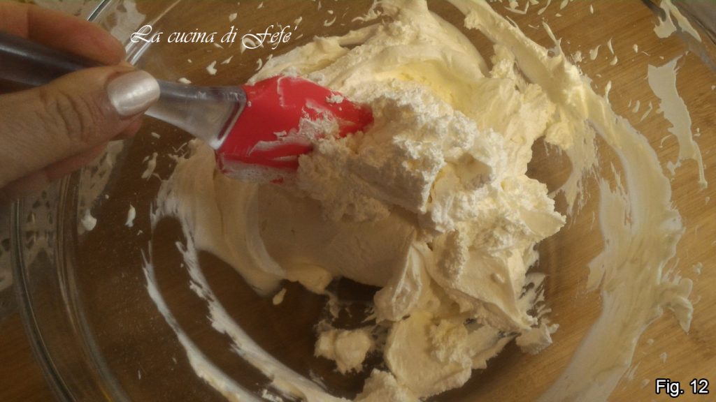 Die sehr kalte und bereits gesüßte Sahne steif schlagen und nach und nach langsam in die Mascarpone-Mischung einarbeiten, mit Bewegungen von unten nach oben.