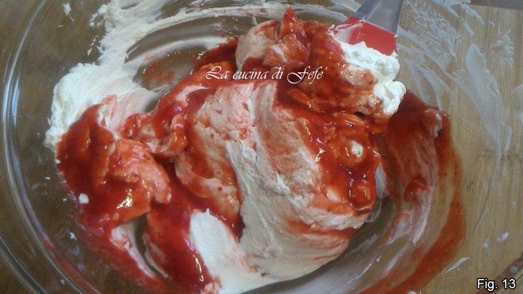 Schließlich auch den Erdbeercoulis nach und nach einarbeiten, mit vorsichtigen Bewegungen, um zu vermeiden, dass die Sahne zusammenfällt.