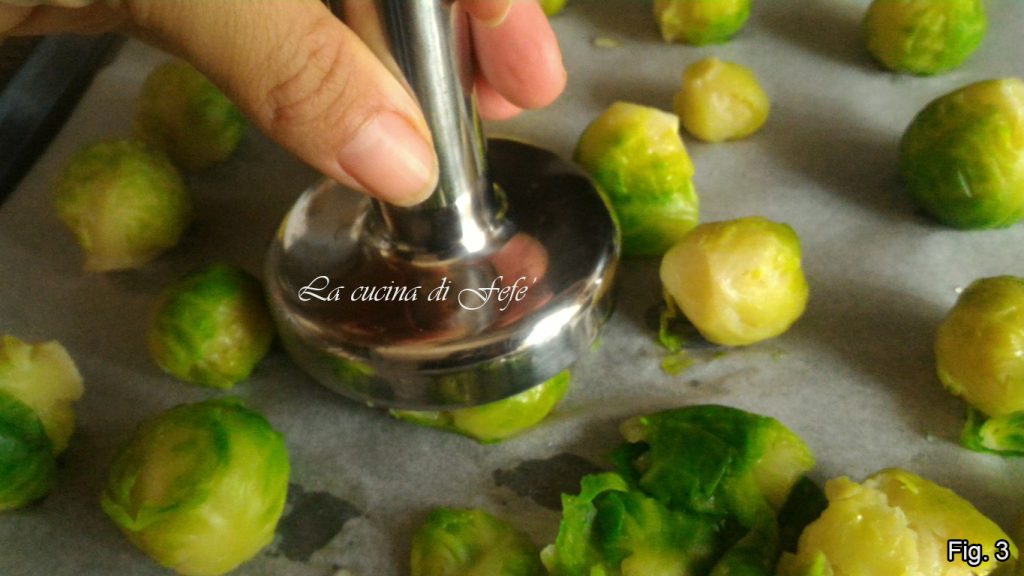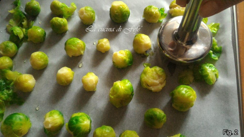 • Kocht den Rosenkohl in reichlich gesalzenem Wasser für ca. 10′ ab dem Kochen oder bis sie weich sind, dann gut abtropfen lassen und auf einem mit Backpapier ausgelegten Backblech verteilen.
