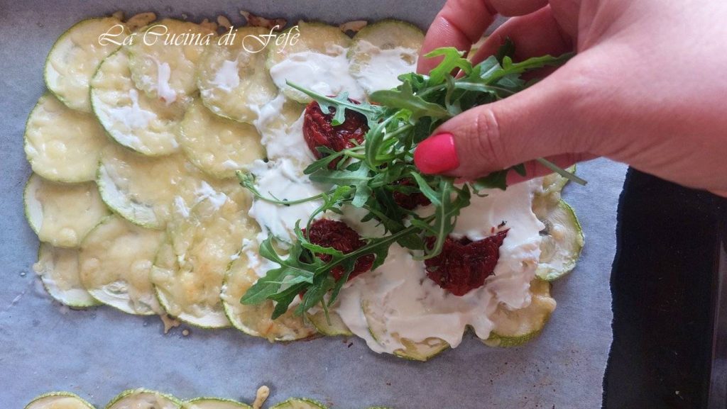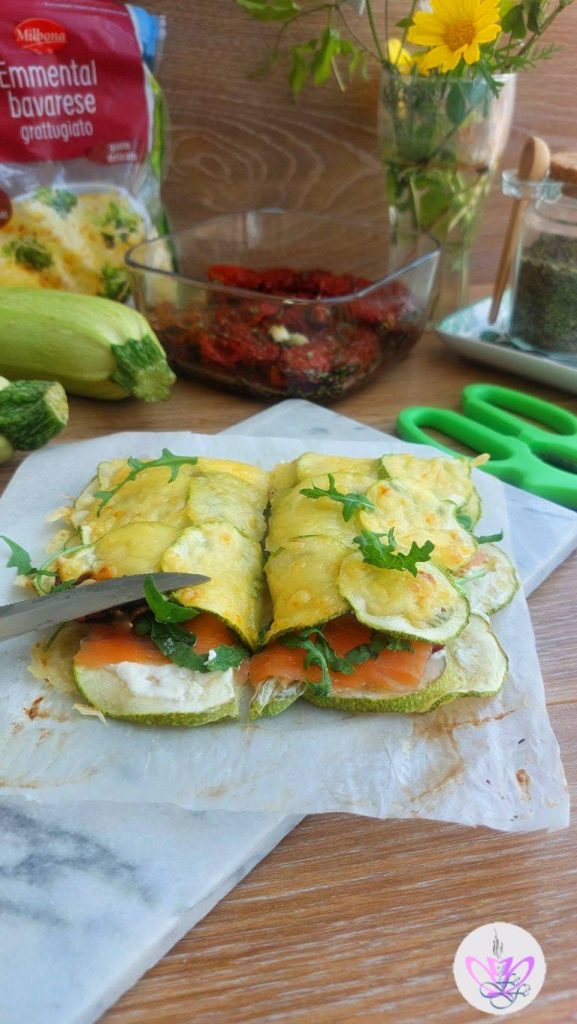 Wer mich kennt, weiß, wie gerne ich mit Gemüse spiele und immer neue Gerichte auf den Tisch bringe! Die Zucchini-Sandwiches kommen diesem Bedürfnis entgegen, da sie eine wirklich einfache Lösung und extrem schnelle Art sind, einen leichten Brunch, gesund und sättigend zu genießen. Die Zucchini wird in nicht zu dünne Scheiben geschnitten, in einer Reihe auf ein mit Backpapier ausgelegtes Backblech gelegt und mit geriebenem Käse bestreut. Die Backzeit ist kurz und fertig! Du hast zwei Sandwiches, die nach Belieben gefüllt werden können. Ich habe darin Frischkäse, getrocknete Tomaten, Rucola und geräucherten Lachs verwendet, aber die Möglichkeiten sind endlos, zum Beispiel mit Wurst oder anderen Käsesorten. Die Zucchini-Sandwiches können auch in der Heißluftfritteuse gebacken werden; die Backzeiten dafür findest du am Ende des Rezepts. Sie sind perfekt für einen Ausflug oder als Snack im Büro. Wenn du sie für die ganze Familie zubereitest, empfehle ich, die Mengen zu verdoppeln, und du wirst sehen, dass sie dein Joker in der Küche werden!