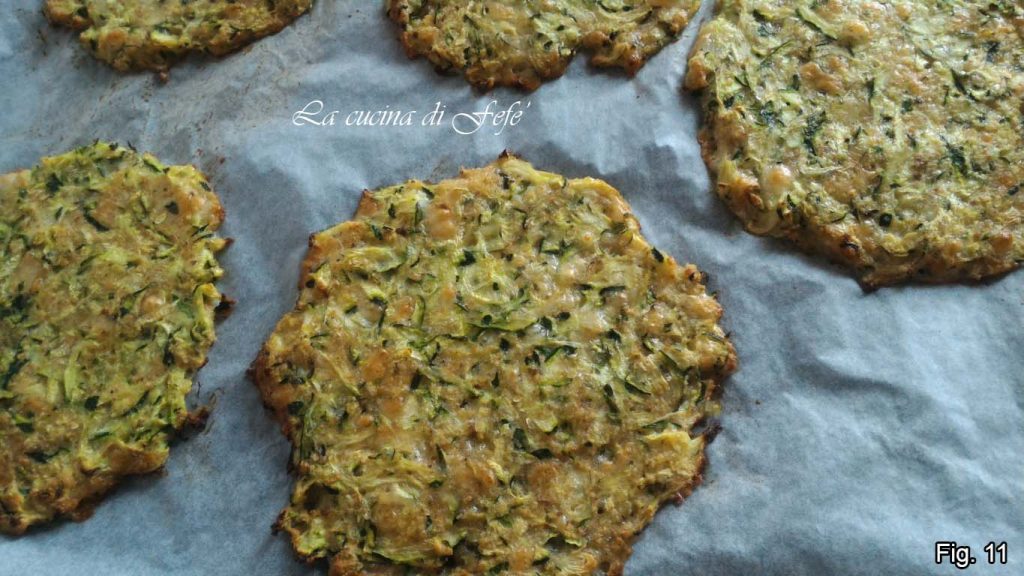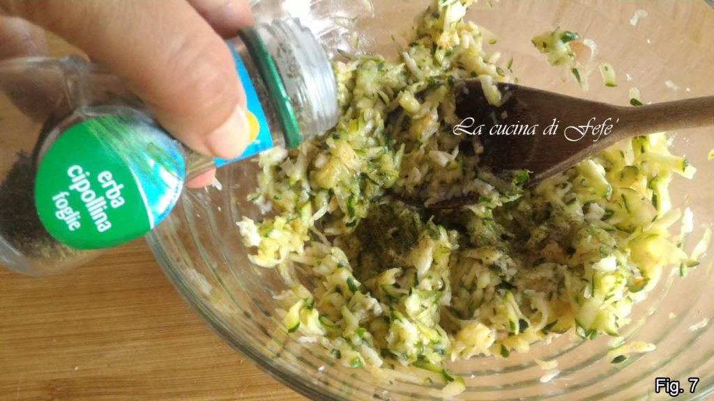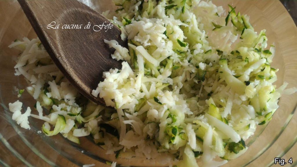 • Gebt die trockenen Zucchini dann in eine große Schüssel, fügt den Parmesan und den geriebenen Provola hinzu und mischt (Abb. 4).