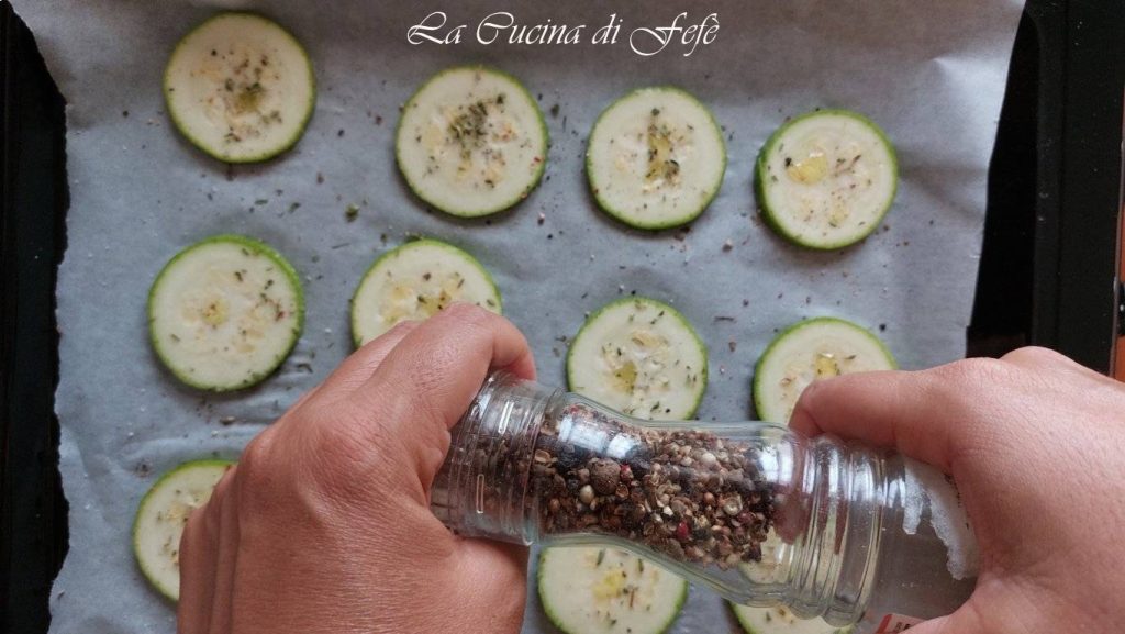 Platziert die größeren Zucchinischeiben als Basis für eure Türmchen auf einem mit Backpapier ausgelegten Backblech, dann salzt, würzt mit nach Geschmack Oregano, ein paar Sprühstöße Öl und etwas gemahlenem Pfeffer (Abb. 3).