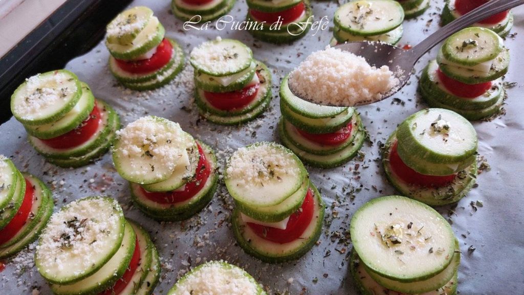Wie viele von euch bereits wissen, probiere ich, wenn ich in der Küche ein gelungenes Gericht zubereite, gerne später verschiedene Varianten davon aus! Deshalb habe ich, nachdem ich meiner Familie meine unwiderstehlichen überbackenen Auberginentürmchen mit Oregano vorgestellt habe, beschlossen, das gleiche Prinzip mit anderen saisonalen Gemüsesorten anzuwenden, wie Zucchini, dank ihrer unglaublichen Vielseitigkeit! Ich muss sagen, diese Version schien mir sogar noch schmackhafter! Ob das nun daran liegt, dass ich im Allgemeinen Zucchini gegenüber Auberginen bevorzuge oder weil ich alles mit reichlich Oregano gewürzt habe, den mir gestern Abend meine liebe Schwiegermutter geschenkt hat und den ich sehr liebe, sei dahingestellt! Wie dem auch sei, diese Türmchen sind wirklich appetitlich und köstlich, sowohl als lustiger Fingerfood-Vorspeise als auch als reichhaltige und schmackhafte Beilage! Und ihr könnt sicher sein, dass sie euch in der Familie nicht wenige Zufriedenheit schenken werden! Übrigens sind sie in sehr kurzer Zeit zubereitet, was sicherlich auch kein Nachteil ist, oder? Einfach das rohe Gemüse stapeln und fertig. In weniger als einer Stunde habt ihr ein wirklich originelles und schmackhaftes Gericht auf dem Tisch!