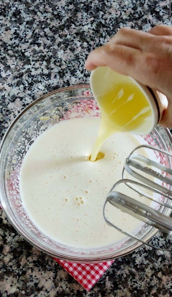 Fügen Sie die geschmolzene Butter und einen Becher Naturjoghurt hinzu. Mischen.
