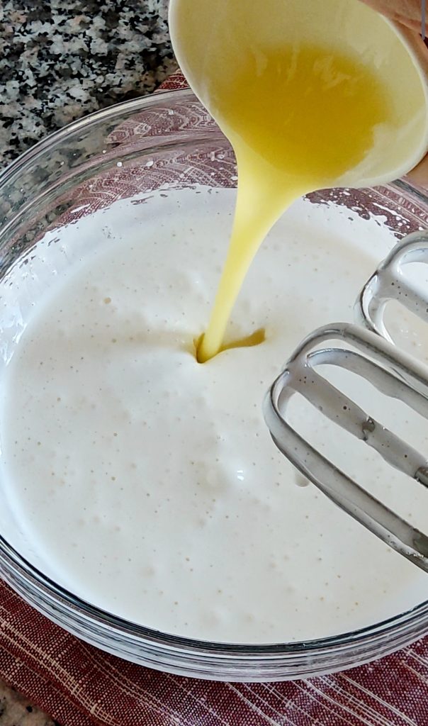Fügen Sie die geschmolzene Butter und einen Becher Naturjoghurt hinzu. Mischen.
