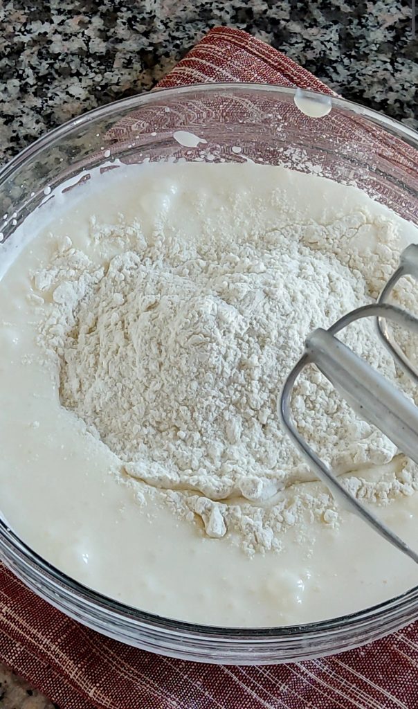 Fahren Sie mit der Zubereitung fort, indem Sie das gesiebte Mehl, den Zimt und das Backpulver hinzufügen. Mischen.