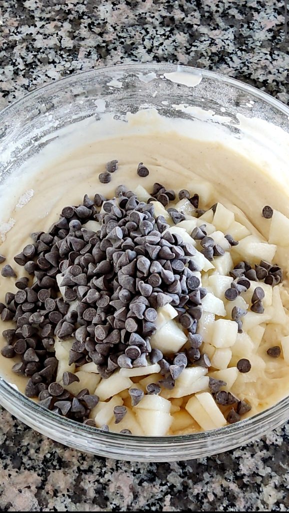 Geben Sie die Birnenwürfel und die Schokoladendrops in den Teig. Rühren Sie mit einem Spatel, um sie in den Teig einzuarbeiten.