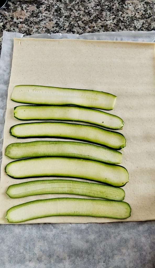 Breiten Sie eine rechteckige Rolle Blätterteig auf der Arbeitsfläche aus. Bedecken Sie die gesamte Oberfläche mit den Zucchinischeiben in 2 Schichten und überlappen Sie sie leicht.