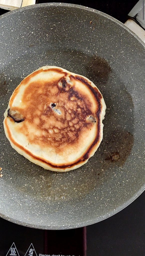 Fetten Sie eine Antihaftpfanne ein und erhitzen Sie sie. Gießen Sie 2 Kellen Teig ein und lassen Sie die Pancakes bei mittlerer Hitze braten. Sobald sich viele Blasen auf der Oberfläche bilden, ist es Zeit, die Pancakes zu wenden.
