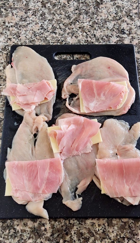 • Fügen Sie eine Scheibe gekochten Schinken hinzu. Füllen Sie auf die gleiche Weise alle Hähnchenscheiben. Falten Sie sie in der Mitte und versuchen Sie, die Füllung innen zu platzieren.