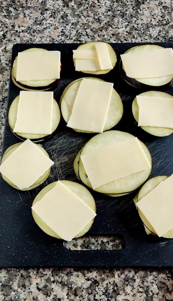 Füllt die Hälfte der Auberginenscheiben mit einer Scheibe Käse und einer Scheibe gekochtem Schinken.