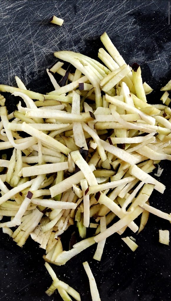 Schneidet die Aubergine zuerst in dünne Scheiben und dann in feine Streifen. Gebt die Aubergine zu den anderen Gemüse in die Schüssel. Gebt eine Prise Salz und das Kichererbsenmehl hinzu.