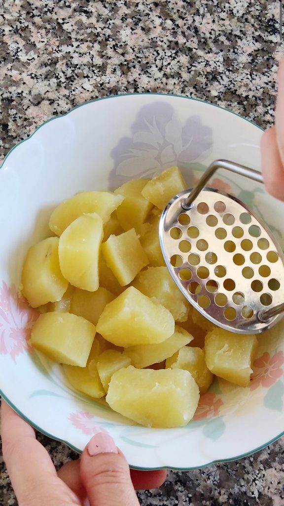 Kartoffeln schälen. Waschen und für 25-30 Minuten in kochendem Wasser garen lassen. Die Garzeit der Kartoffeln hängt von der Qualität und Größe der verwendeten Kartoffeln ab. Daher empfehle ich, die Garstufe mit den Zinken einer Gabel zu testen.