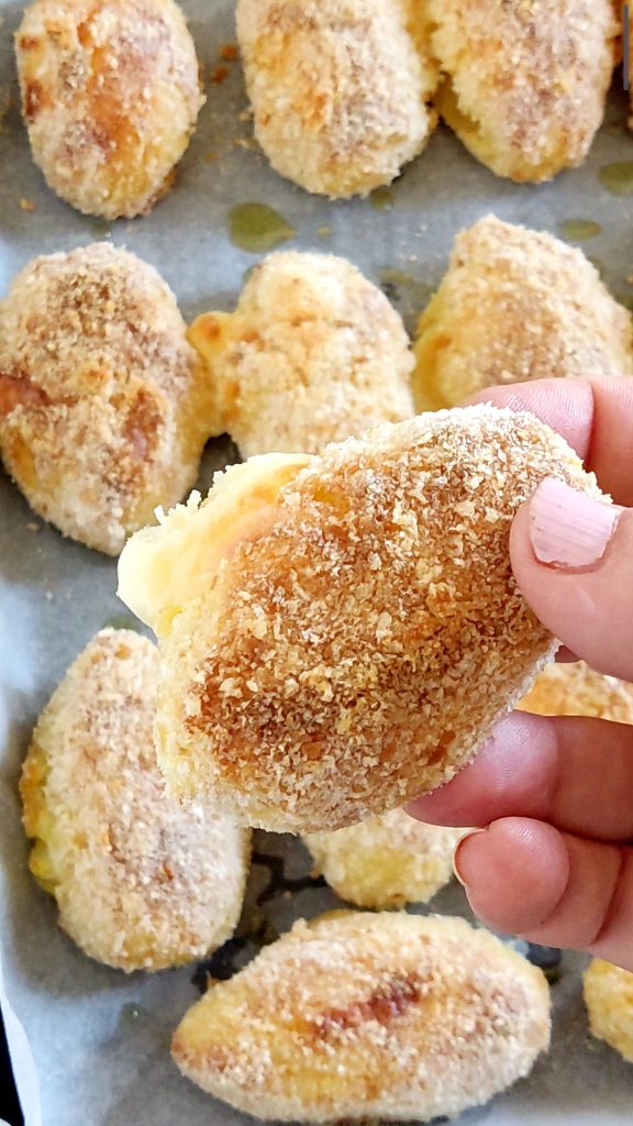Während Sie sie zubereiten, auf ein mit Backpapier ausgelegtes Backblech legen. Die Kroketten leicht mit Öl bestreichen. Im vorgeheizten Ofen bei 200° 18-20 Minuten backen.