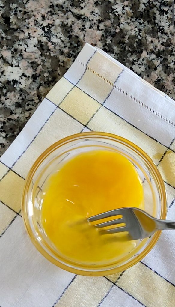 Vermischt in einer Schüssel die Semmelbrösel mit dem geriebenen Parmesan. Schlagt in einer kleinen Schüssel das Ei mit einer Prise Salz.