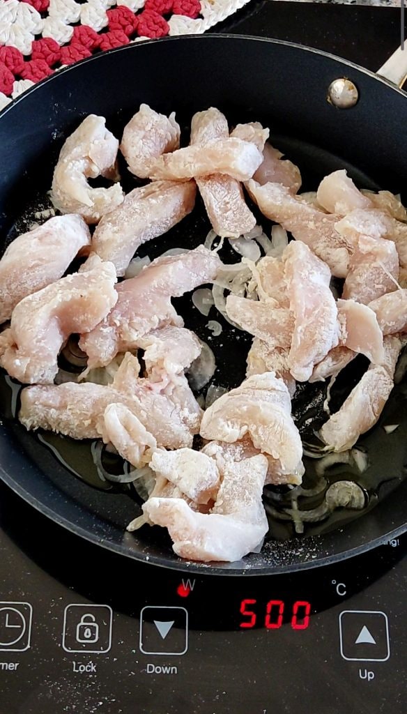 Gießt 3-4 Esslöffel extra natives Olivenöl in eine Pfanne. Fügt die fein geschnittene Zwiebel und das Hähnchen hinzu.