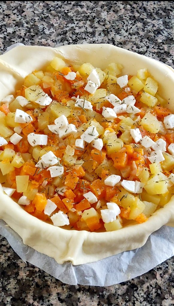 Wie man den Blätterteigkuchen mit Kürbis und Kartoffeln zubereitet