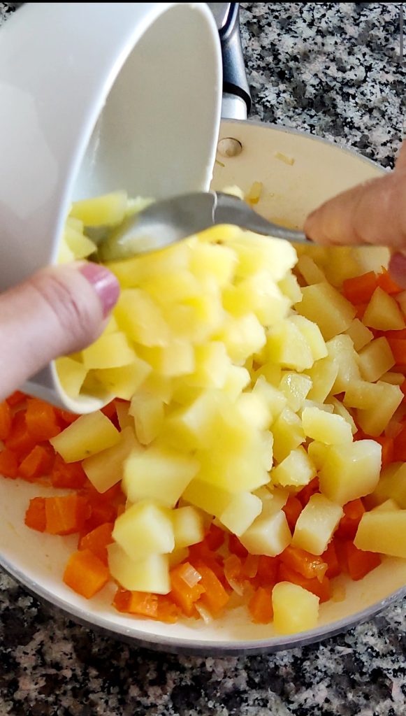 Schälen Sie die Kartoffeln, waschen Sie sie und schneiden Sie sie in Würfel. Lassen Sie die Kartoffeln 20-24 Minuten in kochendem Salzwasser garen. Testen Sie die Garzeit, indem Sie sie mit einer Gabel einstechen. Abgießen. Den Kürbis putzen und in kleine Würfel schneiden.
