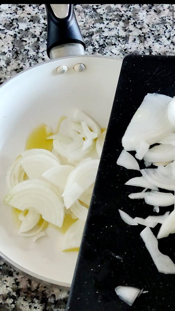 Geben Sie 2 Esslöffel Olivenöl in eine Pfanne. Fügen Sie auch die Zwiebeln hinzu und lassen Sie sie bei schwacher Hitze für 7–8 Minuten garen. Rühren Sie häufig mit einem Holzlöffel um, damit sie gut weich werden.