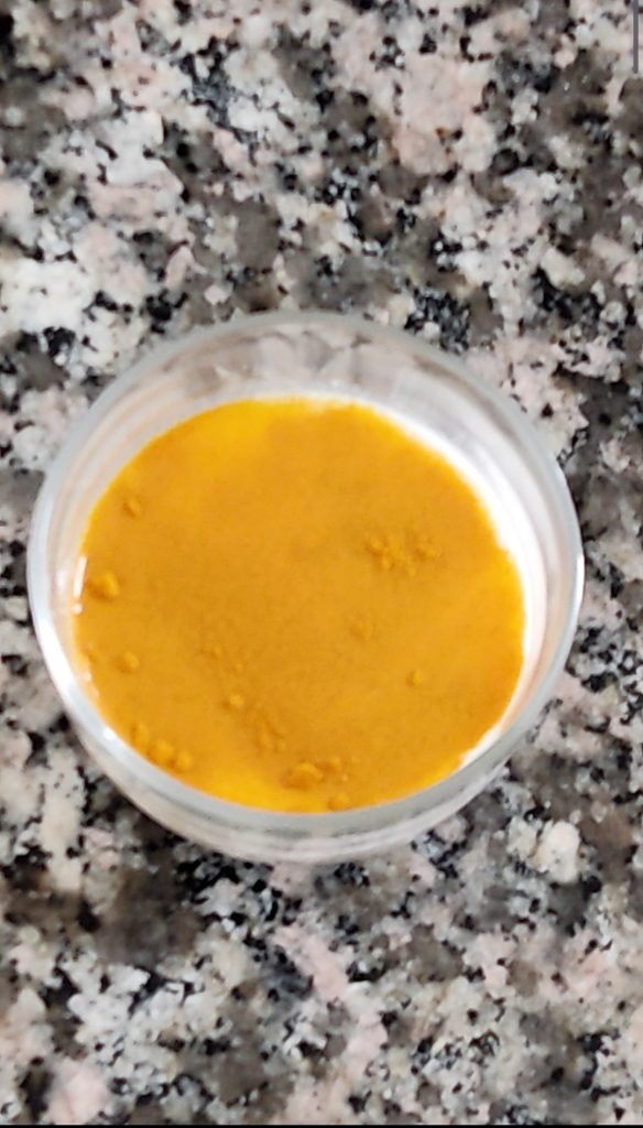 Würze mit Salz und Pfeffer. Mische in einer kleinen Schüssel die Milch mit der Kurkuma. Gieße die Milch und Kurkuma über das Huhn und die Zucchini. Mische bei mittlerer Hitze 2 Minuten gut durch.