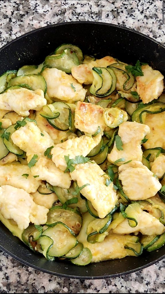 Huhn und Zucchini mit Kurkuma, sehr zart und köstlich. Das Rezept, das ich euch heute erzählen möchte, ist das eines einfachen und schnellen Hauptgerichts, das wirklich sehr gut ist. Hähnchenbruststückchen mit Zugabe meiner geliebten Zucchini, eingetaucht in eine köstliche orangefarbene Kurkuma-Creme. Bereite gleichzeitig das Hauptgericht und seine Beilage zu und erobere im Handumdrehen alle am Tisch. Das Rezept ist einfach und garantiert erfolgreich und sowohl heiß als auch kalt lecker zu genießen. Kurkuma hat entzündungshemmende und antioxidative Effekte, ist eine gute Quelle für Ballaststoffe, die helfen, den Cholesterinspiegel im Blut zu senken. Es liefert gute Mengen an B-Vitaminen, Eisen, Kalium und Vitamin K. Und dann macht seine orange Farbe alle Gerichte besonders. Also los in die Küche und bereiten wir gemeinsam das Huhn mit Zucchini und Kurkuma zu