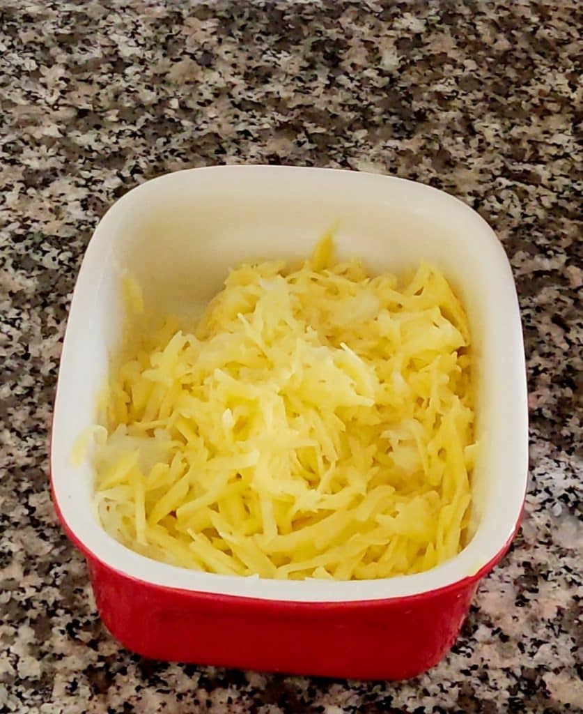 Schälen Sie die Kartoffeln und waschen Sie sie. Säubern Sie auch die Zwiebeln. Mit einer groben Reibe die Kartoffeln und Zwiebeln in dünne Streifen in einer Schüssel reiben.