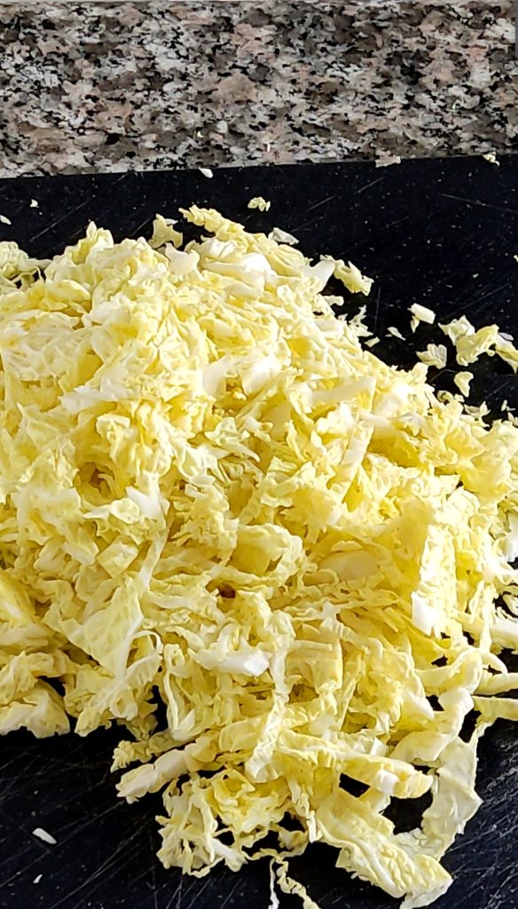 Entfernen Sie die äußeren Blätter und den Strunk vom Wirsing. Schneiden Sie den Wirsing in dünne Streifen. Waschen Sie ihn und lassen Sie ihn gründlich abtropfen.