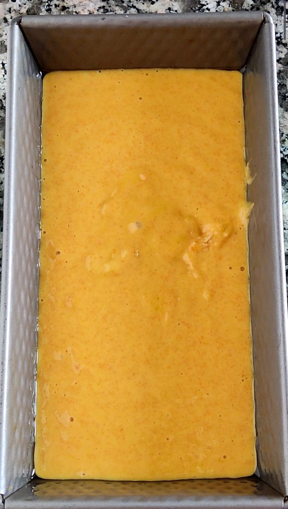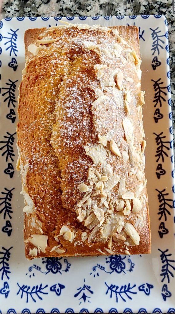 Fügen Sie nun das gesiebte Mehl und das Backpulver hinzu. Gut mischen. Gießen Sie den Teig in eine Plumcake-Form, meine Form misst 20 x 11 cm. Fügen Sie auf der Oberfläche die gehobelten Mandeln hinzu.