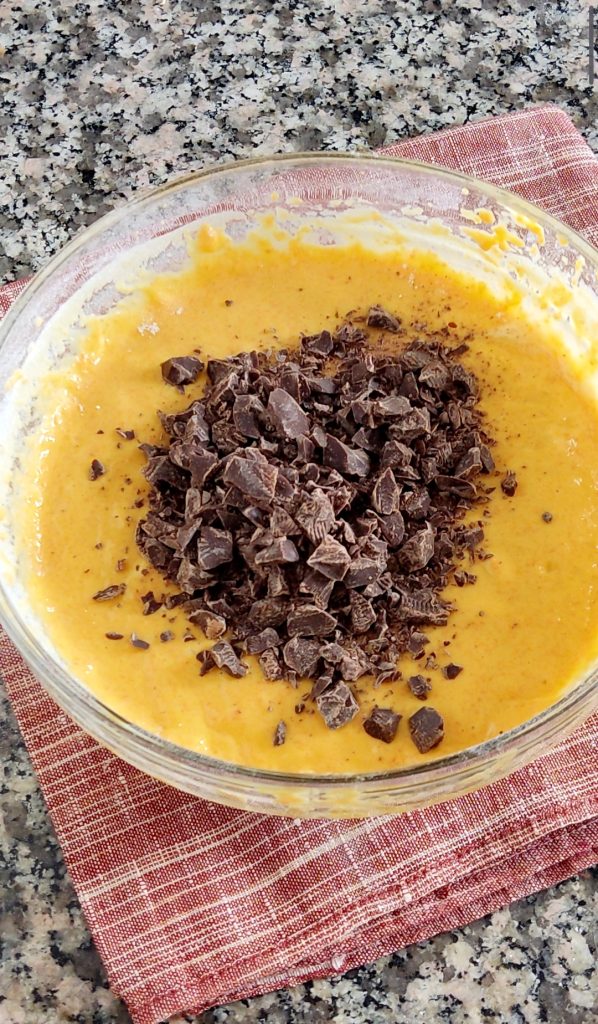 Fügen Sie die Zartbitterschokolade in kleinen Stücken hinzu und mischen Sie einfach mit einem Spatel, um sie in den Teig einzuarbeiten.