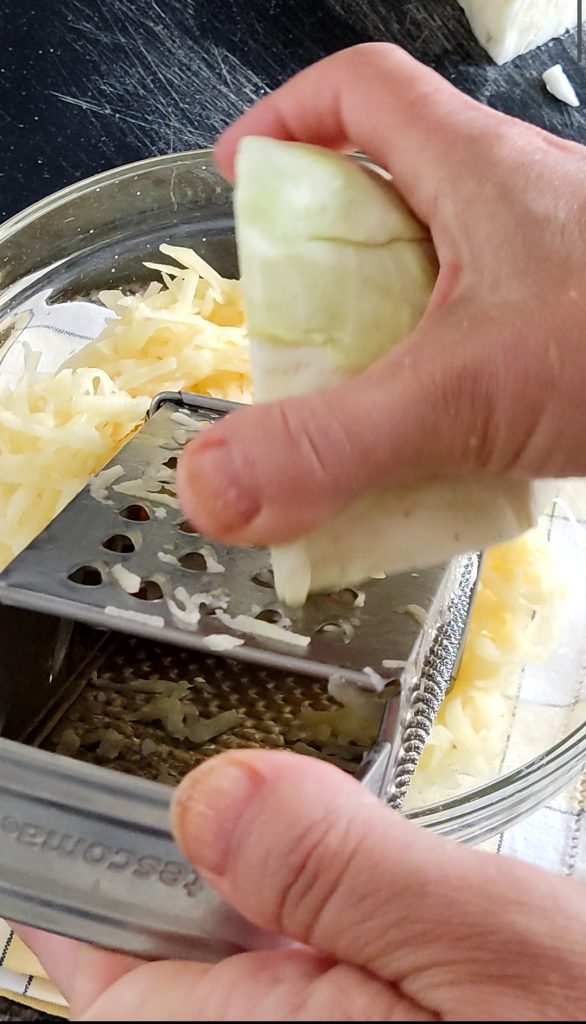 Mit einer groben Reibe reiben Sie die Kartoffeln und den Kohlrabi in feine Streifen in eine Schüssel.
