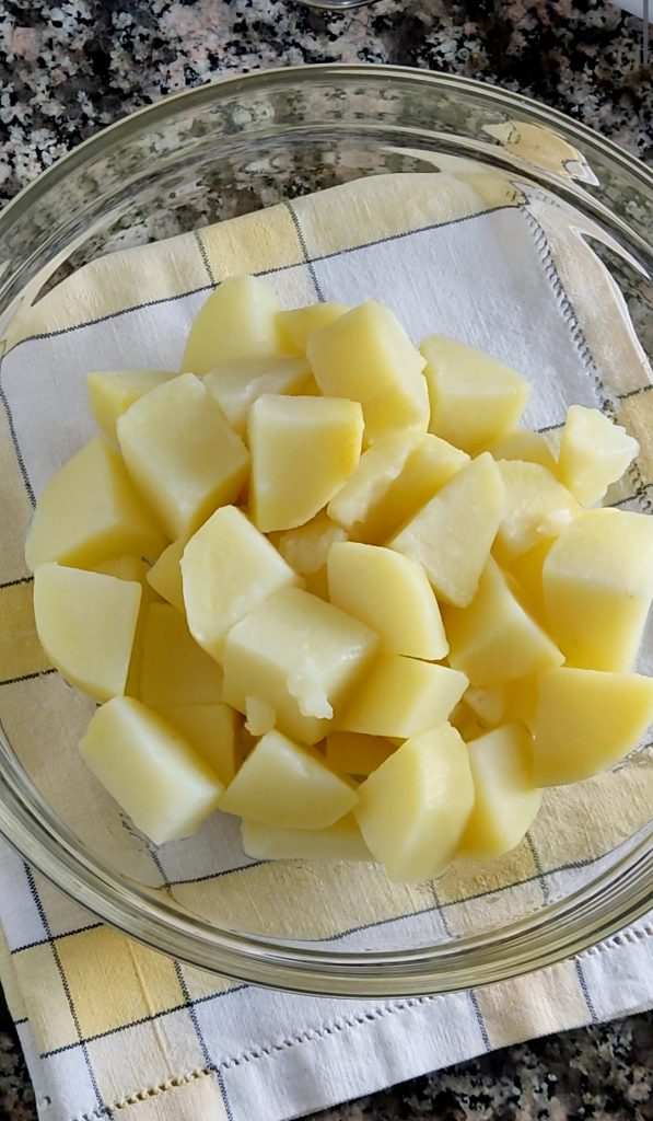 Schälen Sie die Kartoffeln. Waschen Sie sie und schneiden Sie sie in Stücke. Kochen Sie die Kartoffeln in kochendem Wasser für etwa 20 Minuten. Testen Sie die Garstufe der Kartoffeln, indem Sie sie mit den Zinken einer Gabel durchstechen. Gießen Sie die Kartoffeln ab.